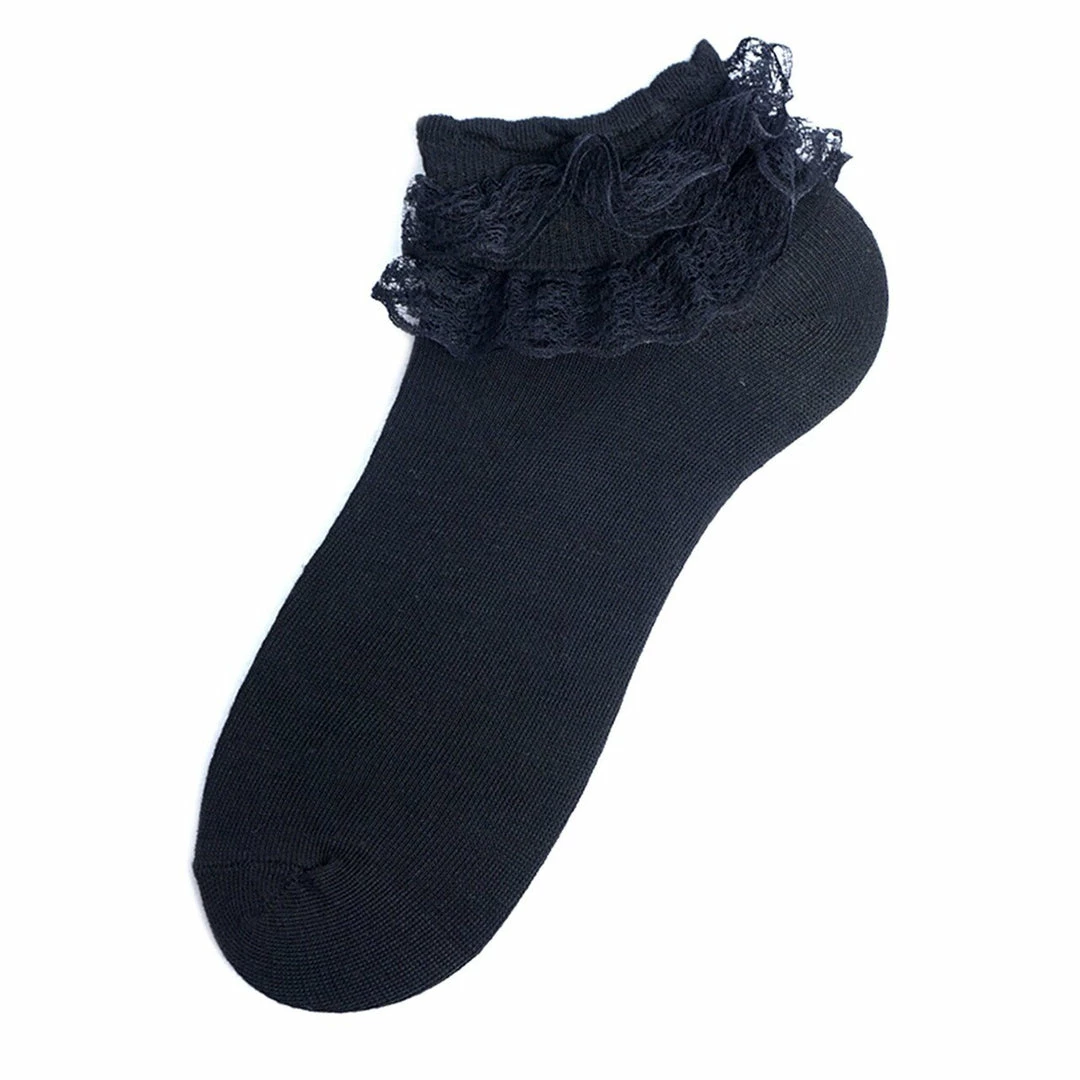 Comfortable and adorable ruffled socks in black fit most adults and big kids. They are made of 98% polyester and 2% spandex and are perfect for many cosplay and theatrical costumes.