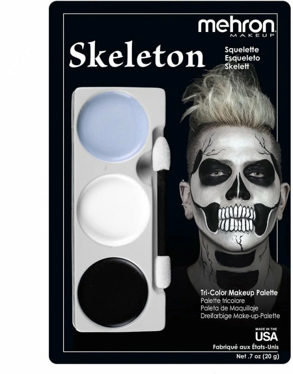 Each of our Tri-Color Palettes contains three colors of our professional cream makeup to create the character pictured on the blister card. Each card comes with detailed instructions on how to apply the makeup and also lists items that will complement the character you are creating. As with any professional cream makeup, Mehron’s Tri-Color Palette makeup should be “set” with Colorset Powder. Available in a variety of characters. Remove with Makeup Remover followed by soap and water.