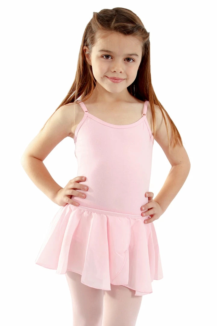 Mock wrap skirt with elastic pull-on waistband. This skirt is soft, lightweight, and easy-to-wear. A great addition to a little ballerina’s dance outfit.