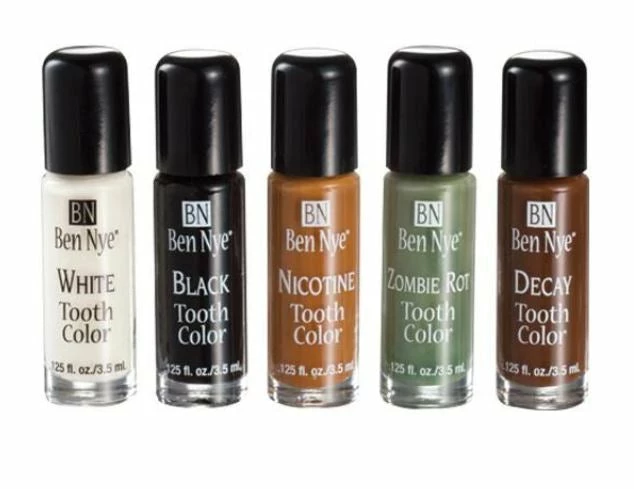 Tooth Colors are perfect for onstage or to add the final touch to a Halloween costume. Black creates broken or chipped teeth. Nicotine, Decay, or Zombie Rot simulates poor dental hygiene. Apply to dry teeth and allow to dry for a few minutes. Reapply as needed. Clean with alcohol on swab and brush clean. Will not stain denture material.