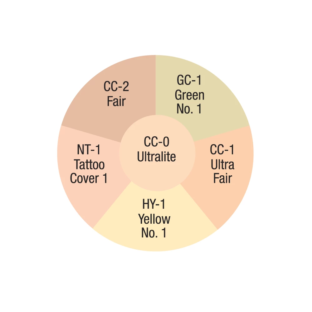 The Total Cover-All Wheel II contains a selection of concealers and neutralizer shades that are ideal for fair to light complexions. Erase discolorations, blemishes, and dark circles from the surface of the skin with our maximum coverage formula. The dense pigmentation in these cremes make easy work out of any skin concealment task. The matte formulation requires little to no setting powder and wears comfortably on the skin. Increase your makeup kit’s efficiency with the compact packaging and clear window. Ideal for use by makeup artists working in bridal, film, television, and photography.