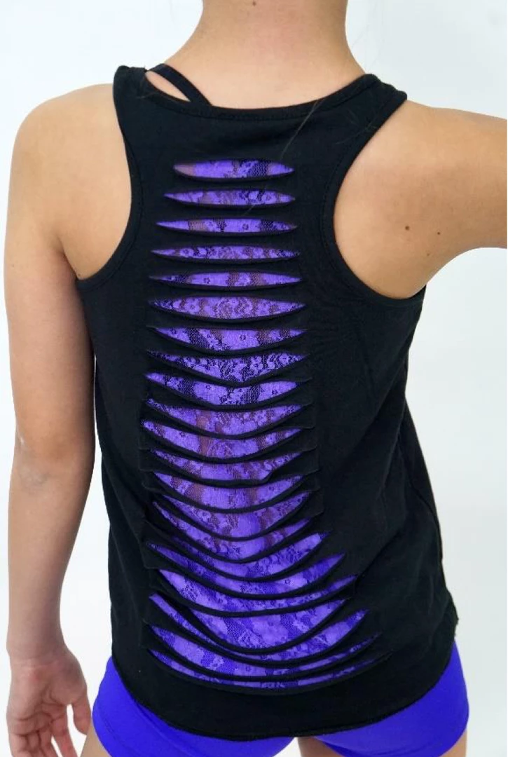 You’ll love going to dance class in your new “Let’s Dance” Tank Top. The shirt is a loose fit soft knit tank style in black with purple script screen printing. The back is unique too with a purple lace liner and horizontal slashes down the back, revealing the purple lace.