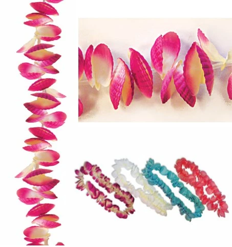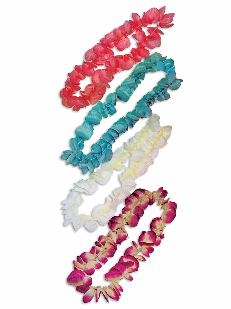 Try something new and different for your tropical themed party, a clamshell floral lei. The silky nylon flowers are pressed into a clamshell shape and attractively places on the lei. Available in a variety of colors to coordinate with any outfit.