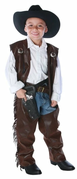 Every Cowboy needs a set of Chaps and Vest for their wardrobe and these are the perfect ones. Made of brown vinyl, the chaps have a fringed edge and attach around the waist with a belt and secure around the leg with straps. The vest has silver conches with fringe attached on the front side. Hat, spurs, and gun belt available separately.