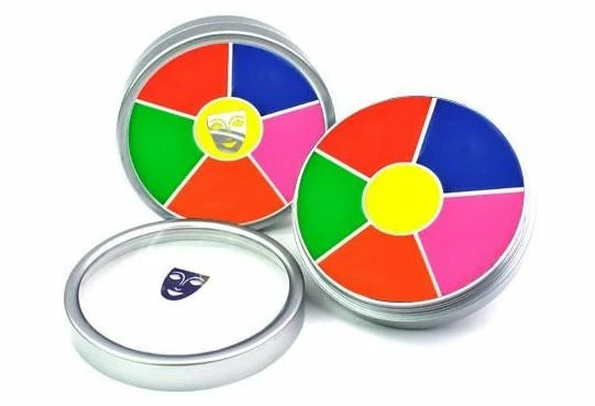 Glows under black light! Cream Color Circle UV-Dayglow is a combination of six different UV colors including Neon Yellow, Neon Green, Neon Pink, Neon Orange, Neon Red, and Neon Blue. These cream paints are specially color intensive and glow already under normal light conditions. Cream Color Circle UV-Dayglow is universally applicable, for example, for baldness effects and masks to achieve special lighting effects under black light. Application is effortless, using only a sponge or brush. Under extreme conditions Fixing Spray is recommended.