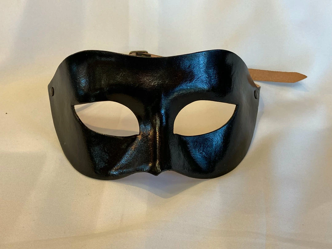 The Bertolini Mask in black is a larger faced deluxe leather style with an adjustable buckle strap. This deluxe style is actually made in Venice. Perfect for men!