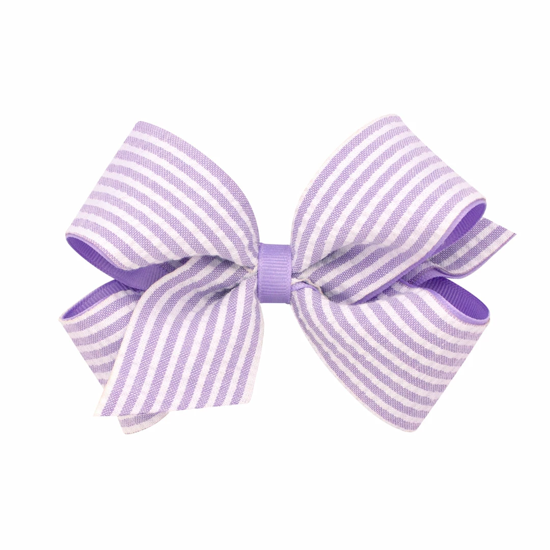 Adorable seersucker overlay grosgrain bow makes you feel like summer is near. Available in lavender or light pink, both have a grosgrain ribbon liner to give the bow substance. We really love these bows because of the great craftsmanship. All bows have a patented no slip clip so the bows stay securely in place without tugging on the hair. Approximate Size: 5″ x 3″ (1 1/2″ Ribbon).