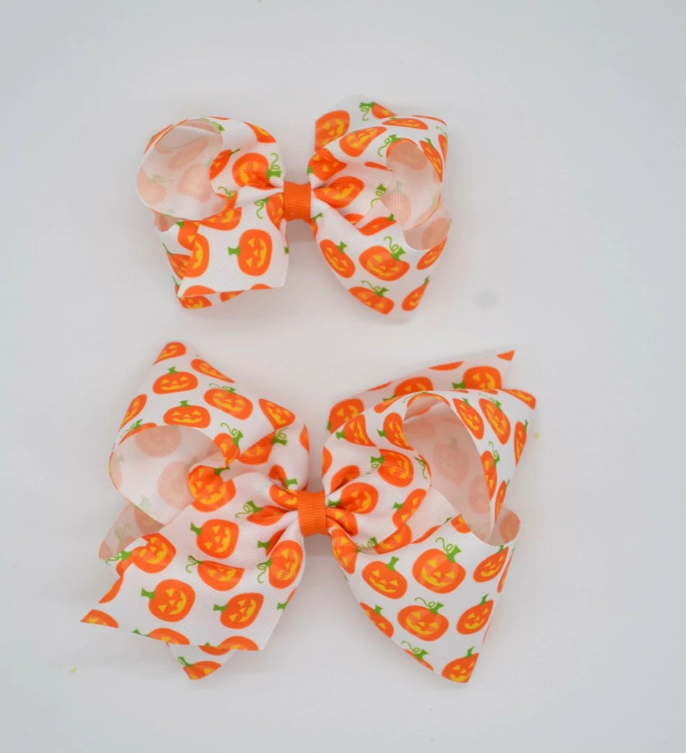 Adorable Pumpkin Print Bow with white background will show how much you love Halloween! This top quality bow has a gripper on the clip so it stays in place and doesn’t slip down. Available in Medium or Large.