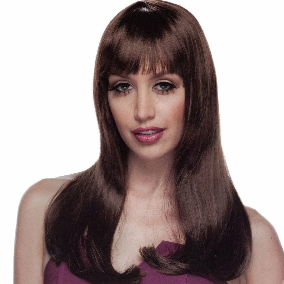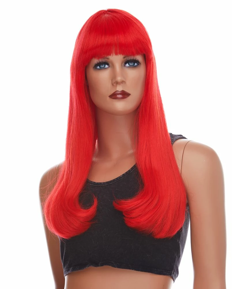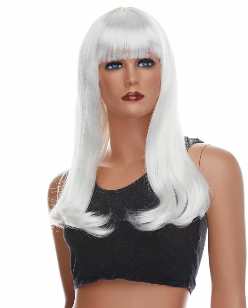 The Diva wig is a long straight wig with blunt cut bangs. Perfect for a wide variety of costume looks. The wig has a nice quality elasticized inner cap for a snug fit. A wig cap to hold you hair is available separately.