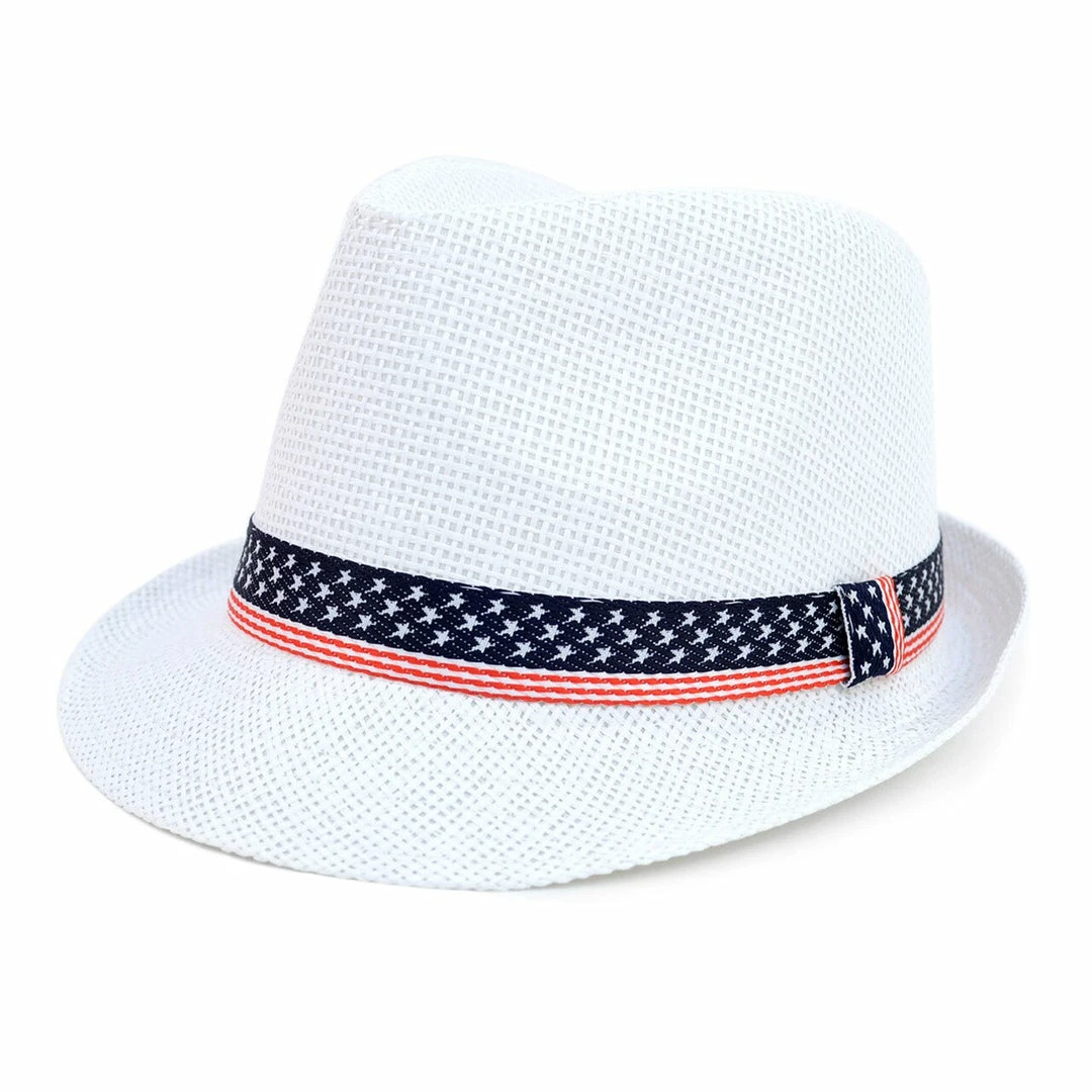 Let Freedom Ring! Show your patriotism with this USA themed American Flag trilby fedora hat. This trilby fedora is the perfect hat for 4th of July, Memorial Day, The Olympics or any day you want to show your American spirit! This fedora features a brilliant white woven 1.5″ brim & a 4″ crown for maximum breathability in the warm spring/summer months. The decorative band around the crown features stars and stripes in red, white & blue.