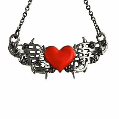 The red heart metal necklace has roses and thorns on wings with an attached chain. The measures approximately 2 inches wide by .75 inches high.