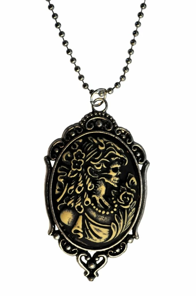 This necklace has a cameo with a silver outline and bronze skeleton in the middle. This piece is perfect to pair with your Day of the Dead costume or to wear all year long!