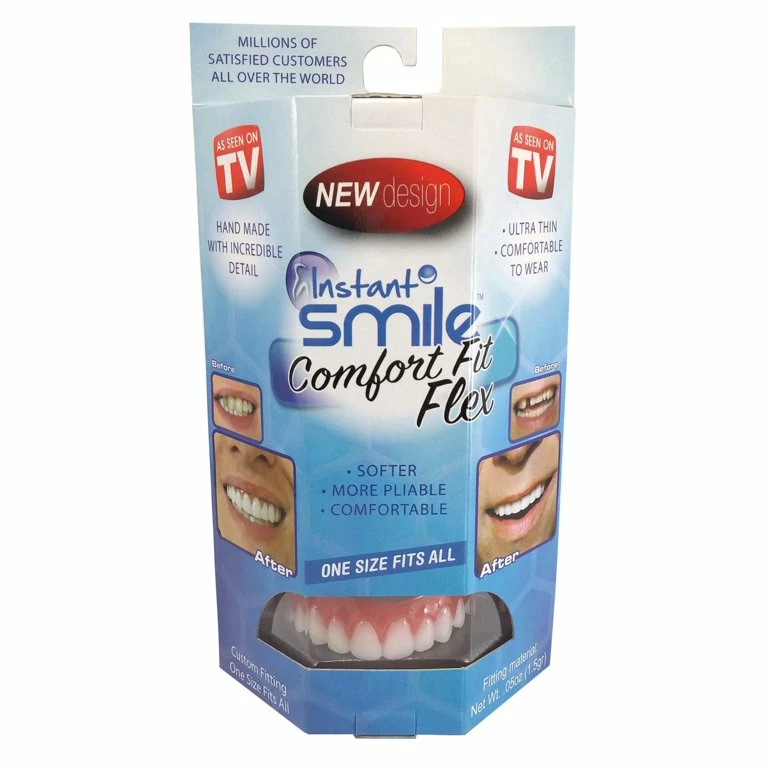 Do you feel insecure about your smile? Do you need a quick and inexpensive fix? Unlike dentures, the Instant Smile Flex are comfortable, flexible and fit over your teeth similar to press on veneers. The perfect adult makeover that is easy to fit within a few short minutes before transforming your teeth into the perfect smile. These handmade, teeth are easy to fit after using hot water following the included instructions. Perfect for everyday use, at your work, college, reunions, weddings and any type of family gathering. Compact carrying case is also included.