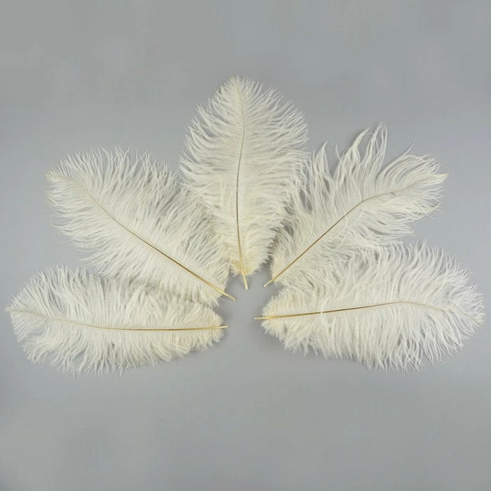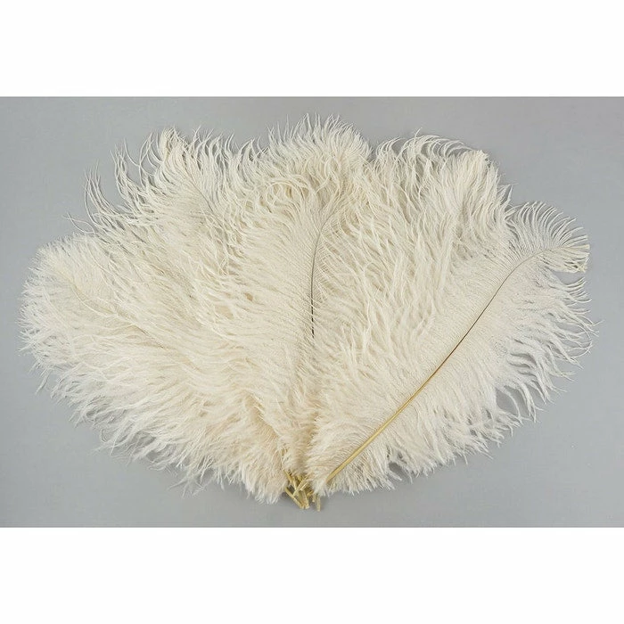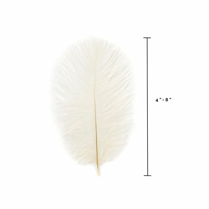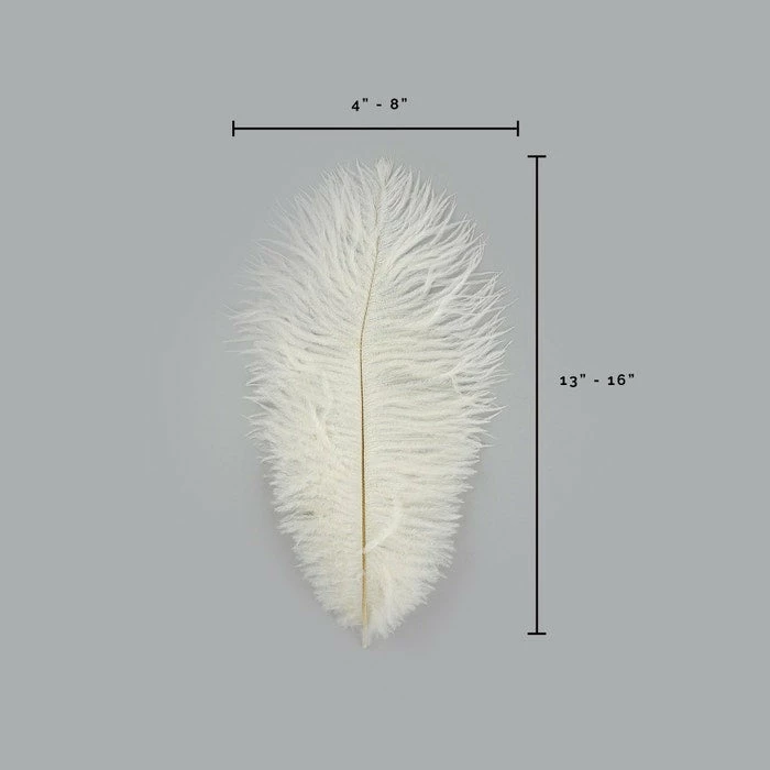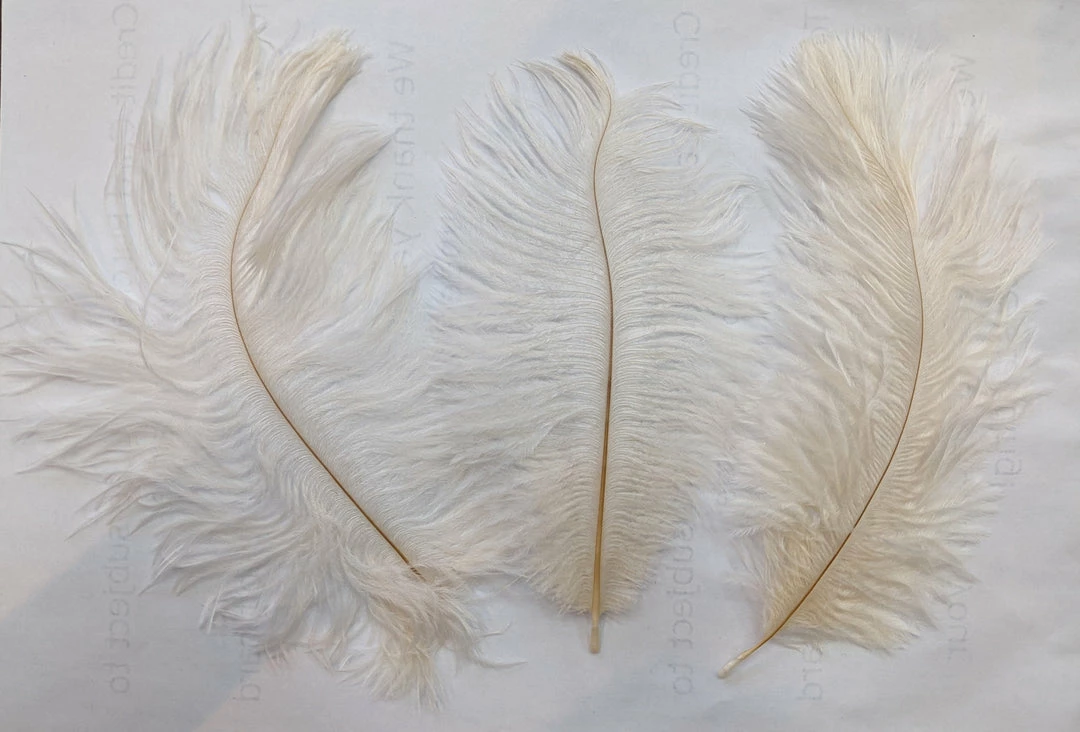 Ostrich Feather Drabs will range in size from 4-16 inches long and are available in a variety of colors. They have wispy hair-like feathers coming out from a stiff center quill (between 1-4 inches long) making the overall width approximately 2-8 inches. Ostrich Drabs are more narrow than plumes, and not as tall. Their quills are softer than plume quills, and the “hairs” don’t hang as much.